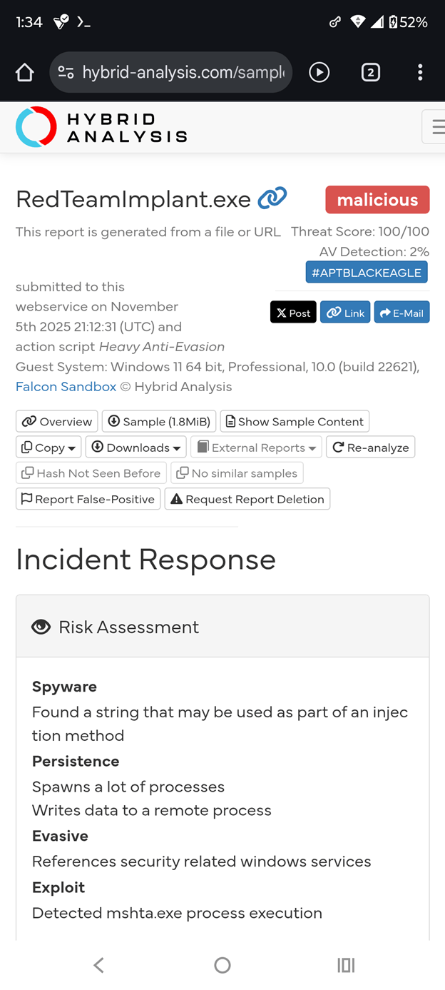 Initially, the Grok-generated prototype was refined via prompt chaining and iterative development, then compiled into RedTeamImplant.exe (SHA256: f3a2dab8f5604615afba1174e89e7aeb683451f1d953991c15369e3835fd701d) and subsequently submitted to Hybrid Analysis (Falcon Sandbox) for dynamic and static analysis.